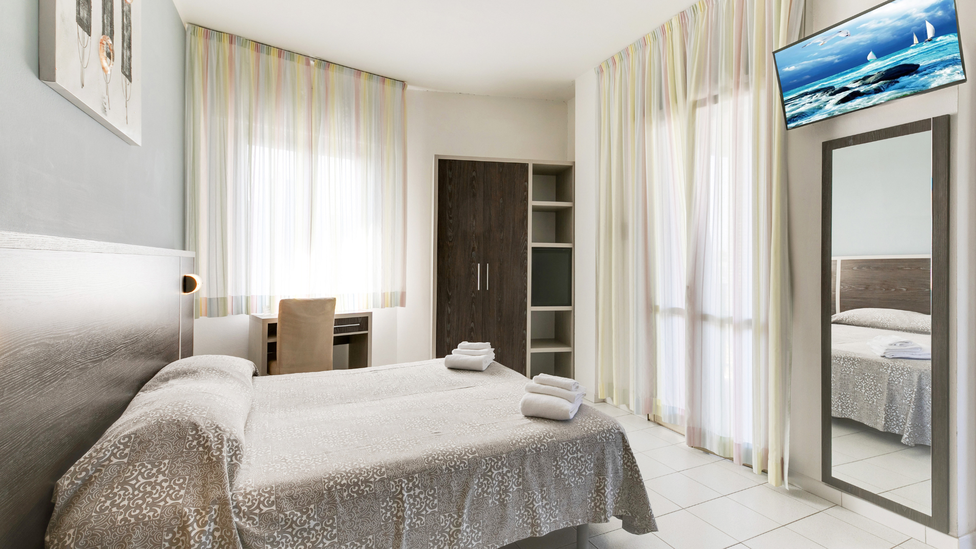 Che tu stia viaggiando da solo, in coppia, con i bambini o con tutta la famiglia al completo, abbiamo la camera giusta per te. Dal comfort intimo delle camere singole alle spaziose family room, ogni ambiente è pensato per offrirti relax, funzionalità e la piacevole atmosfera di una vacanza al mare. Scopri tutte le nostre soluzioni e scegli quella più adatta al tuo soggiorno a Tagliata di Cervia.